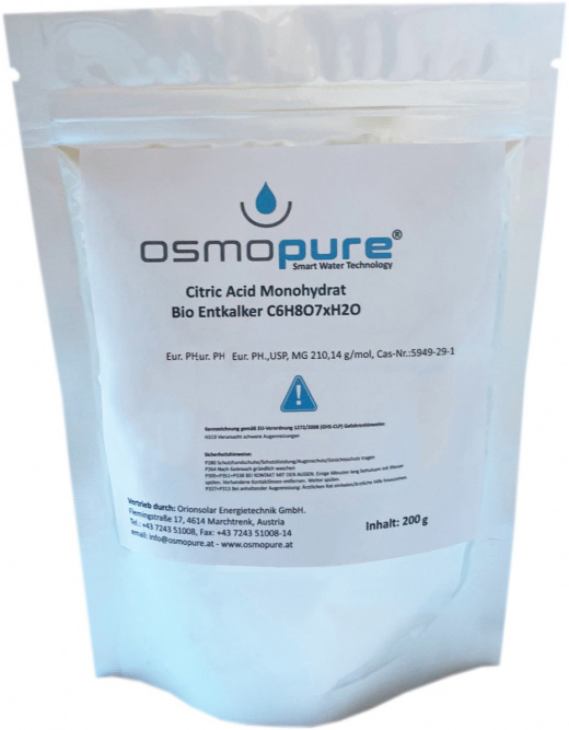 200g. Citric Acid Monohydrat Bioentkalker C6H8O7xH2O für Auftisch Osmoseanlagen von Osmopure® in Pharmaqualität mit Lebensmittelzulassung, Eur. PH.,USP, MG 210,14 g/mol, Cas-Nr.:5949-29-1, Lieferung im wiederverschließbaren Aluminiumbeutel.